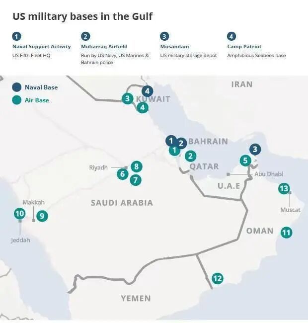 伊朗最悲哀的一点,就是距离美国军事基地太近了,周边的邻国,一个个都是美国的盟友。